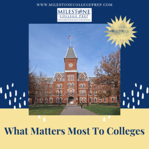 Colleges list the following admission factors as most important, according to The National Association for College Admission Counseling (NACAC). The order of the factors below reflects how many colleges rated the factor “Considerably Important” or “Moderately Important.”